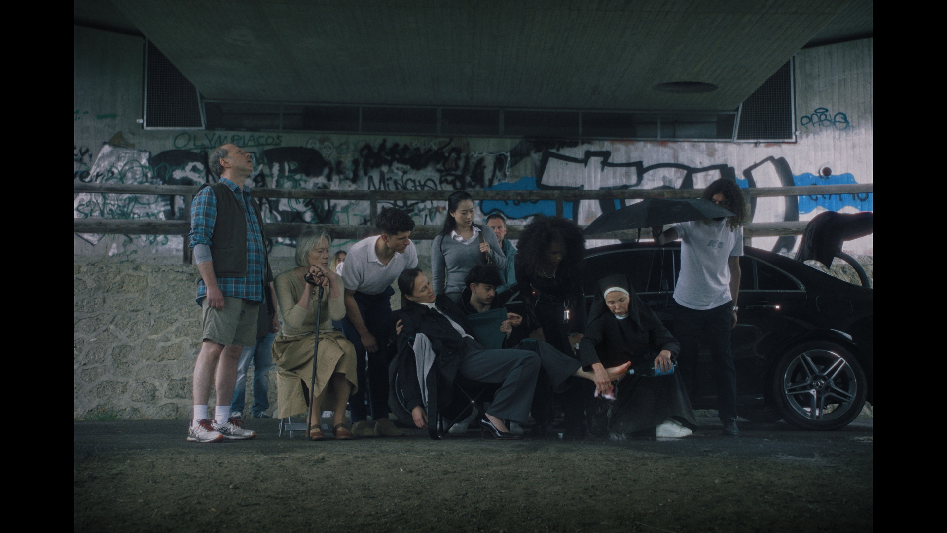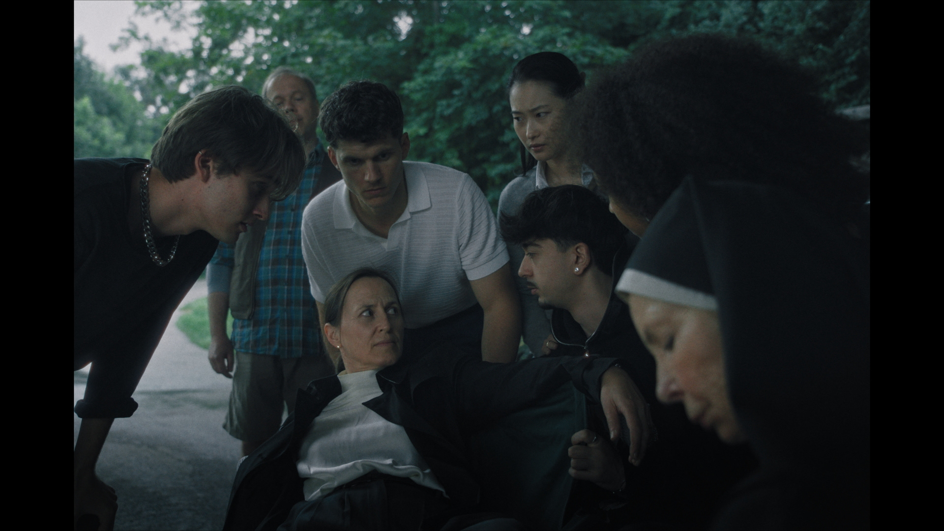 Driven partly by curiosity, partly frozen in shock, a crowd of onlookers gathers around a car accident. Unable and unwilling to intervene, the audience fails to notice the imminent collapse of the bridge above them, threatening to bury them all.